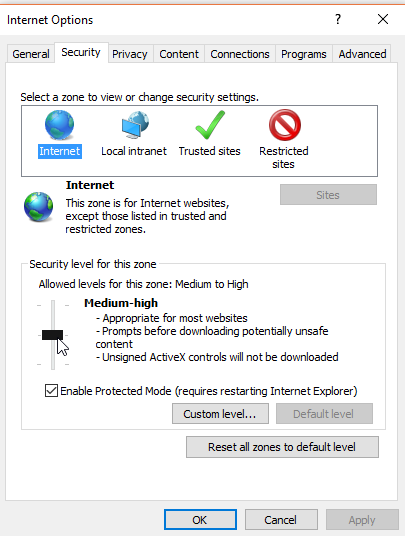 Click on the cog wheel on the top right corner (Tools), then select Internet options.Click on the Security tab at the top and then adjust the bar under Security level for this zone to determine how secure you want your browsing to be. You may also want to click Enable Protected Mode, which adds an extra layer of security from malicious websites.