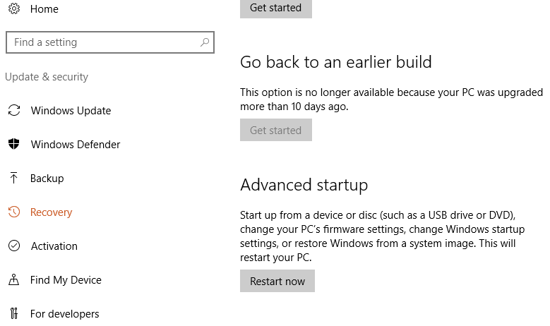 Select Update & security, and then Recovery