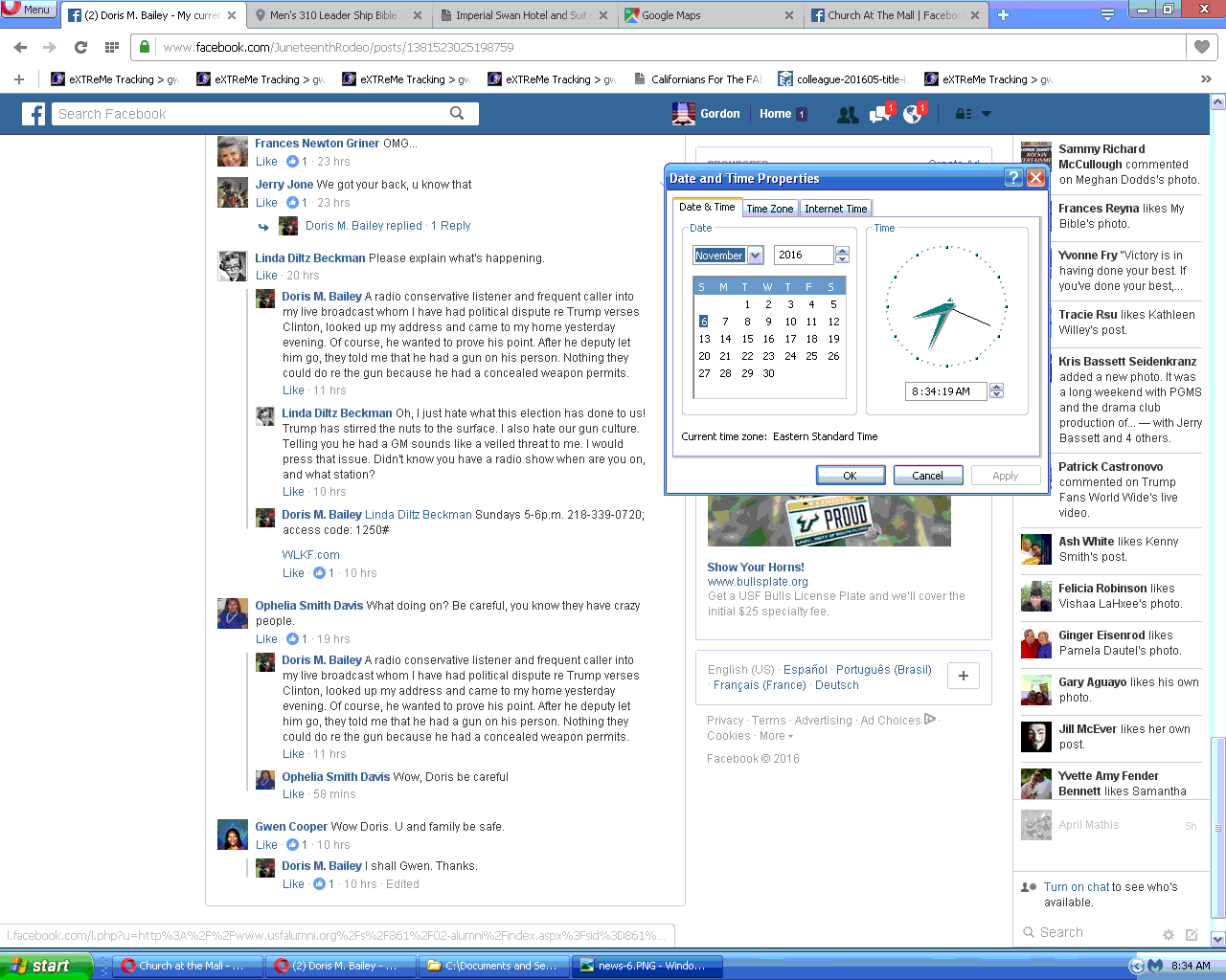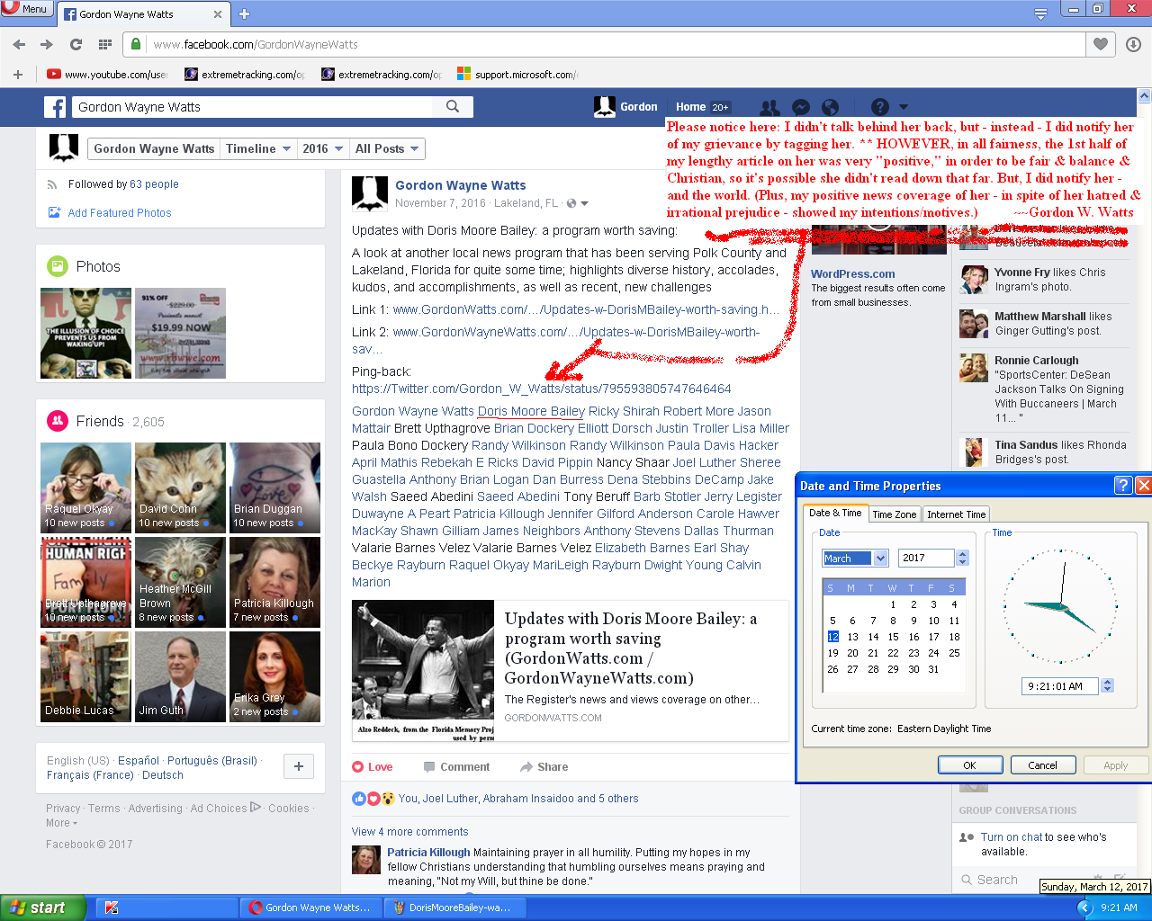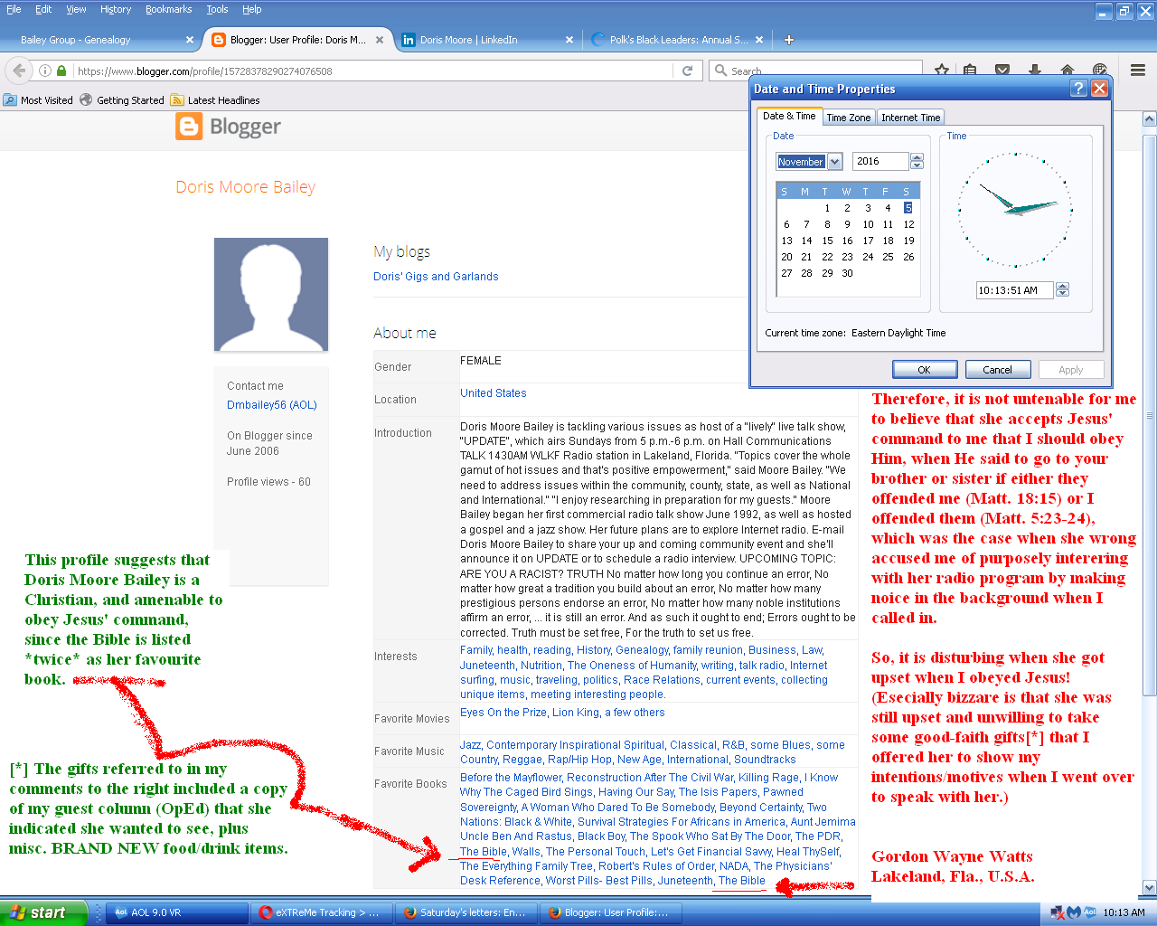 I just now got several disturbing phone calls and messages about this. (I suspected that Ms. Bailey wouldn't "let it go," since whatever caused her to go off the deep end probably is still afflicting her.) First off, I noticed that Ms. Bailey is telling the world a "whole world" of lies about me on one of her public Facebook pages. (No, I'm not stalking her: I'm looking at the public news feed, which is a protected 1st Amendment Right, and she, conversely, is slandering, libeling, and committing defamation of character, against me, here, which is not only illegal, but also morally wrong -and very damaging to her reputation.) My own friends have said: "Gordon, let it go," and while I might have been able to "let it go," had Ms. Bailey not kept pushing lies, it is now clear that this is not going to "go away," unless I take a proactive step to address her complaints. In the Matt. 18:15 passage, I was required to go to her privately & discreetly, so as to not embarrass her; if that doesn't work, I'm supposed to compel 1-2 others, so that in the mouth of 2-3 witnesses (me and the 1-2 others), Matthew 18:16 is fulfilled. Maybe "peer pressure" of 2 or 3 others can convince a person to chill out. Since there were no less than seven (7) witnesses, at the height of the crisis (1.Myself; 2.Milton; 3.GOD is my witness, keep count; 4.Dep. Coburn; 5.Dep. DisNovis; 6.Dep.Smith; and 7.Doris Bailey, herself), I satisfied that prong of Jesus' "conflict resolution" method in Matthew 18:15-17 and Matthew 5:23-24. The 3rd step is to bring it before the entire church for review; while I don't know what 'church' Bailey attends (if any), I will trust God to 'sanctify' the believers, here, online (and elsewhere) - obviously, as I can't resolve this in person (I was asked to leave her property, and am unwelcomed & trespassed, so I must see another method, such as online or via news medić, etc.)