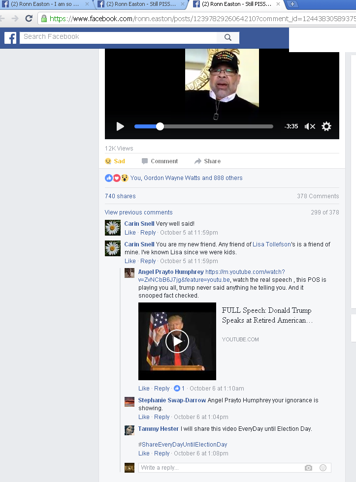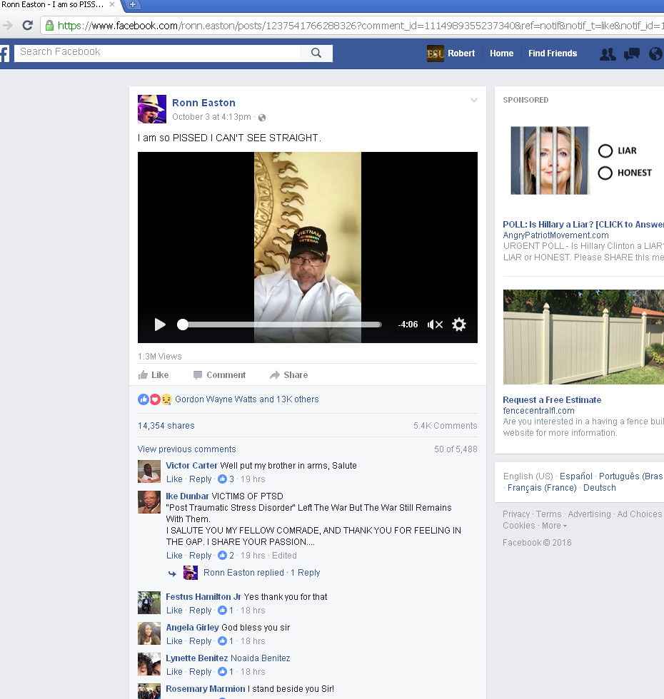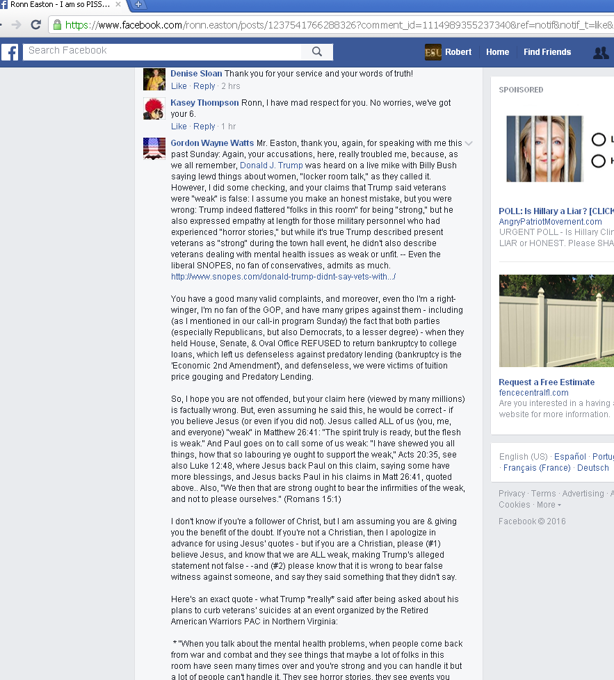 comments, 11K 'Likes,' and 14K shares, in which Easton claimed that Republican Presidential candidate, Donald Trump, said that: “Only weak veterans