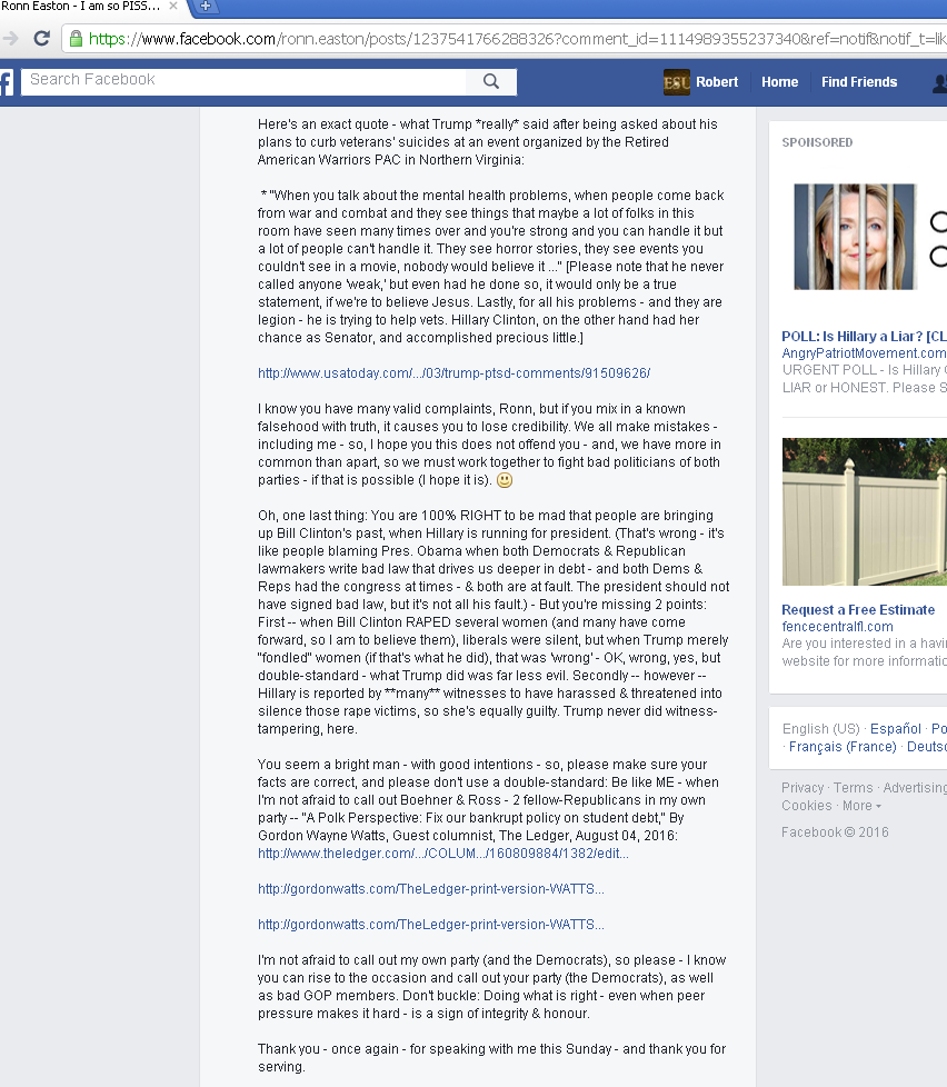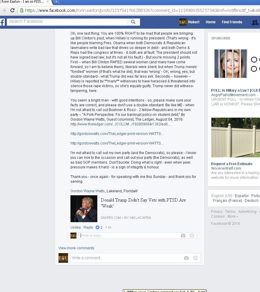 Doris Bailey, who has not removed me from her friend's list or blocked me is fully-capable of emailing me, should she have had any other complaints (that she made above). I am in no small part very hot-angry, but I remember the initial purpose of my Editorial, here, and that was this: Not only to provide interesting news & opinion, but more-importantly, to make the case that both the "Updates with Doris Moore Bailey" program, and the various panelists (Doris Bailey, included) are all valuable people -and a program worth saving. Just remember this: While we were on the radio arguing with each other about how oppressive various things were (be they college debt or unduly restrictive voter-ID laws), our foes were winning, and they were proceeding unchecked, unopposed. Maybe if we all started arguing LESS, then we could have time to WRITE OP-ED's MORE -- such as here: "A Polk Perspective: Fix our bankrupt policy on student debt," By Gordon Wayne Watts, Guest columnist, The Ledger, August 04, 2016: WATTS-GuestColumn (web-page text) ** WATTS-GuestColumn (scanned newspaper image)