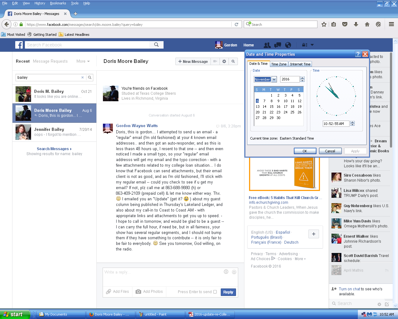More recently, this past August (2016), I emailed her about an "update" (no pun intended) regarding my Aug. 04, 2016 column in The Ledger (local cached copy), which had just published, and where I hold my congressman accountable about the massive college debt burden (one of the areas where Doris and I are in strong agreement). Since I knew she was having computer troubles, I also sent her a short "Facebook email" follow-up, to make sure she had a 'head's up' that my guest column had published: "A Polk Perspective: Fix our bankrupt policy on student debt," By Gordon Wayne Watts, Guest columnist, The Ledger, August 04, 2016 (newspaper cut-out pic)