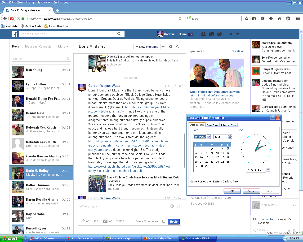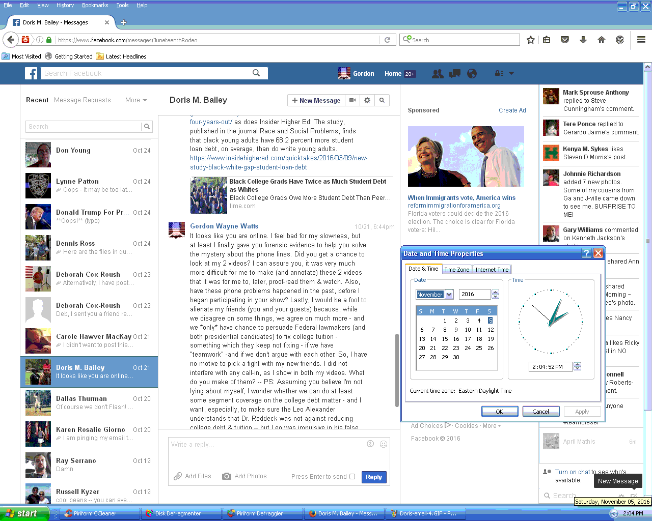 Doris also offered me support in a recent program, when I was trying to explain to Dr. Shandale Terrell (another call-in guest, candidate for Lakeland's Dist. 40 State House, and a new friend of mine) regarding Florida's controversial "Amendment 1," the Solar-Amendment-scam. So, Ms. Bailey is in agreement with many, even if not all, of my political views. (This is not, or at least, should not, be important, as I have many friends who are far more 'Liberal' than her, but I'm building to a point.) OK, my point? I'm unsure of just how to handle this... any suggestions? My progress, so far... Back on 10/16/2016, Doris asked me to turn off my radio - she repeatedly asked me. As you can see, I assured her that my radio was off, and even showed her an older video where the same thing was happening - and proof that my phone was muted, etc., back then (to effectively show her proof of my innocence). That was on 10-19-2016. Since I wanted to move past this nonsense, I also showed her a TIME article that showed Black Americans have twice as much College Debt burden, useful for her program, since she focuses on minority issues. After my 10-19 emails, above, I hadn't gotten a response, so I emailed her again on 10/21/2016 @ 6:44pm, to ask her about this "background noise" complaint that she continually made against me, and also to try and see if I could help 2 guests (Leo and Dr. Reddeck) work out a misunderstanding that they'd had during one program I had partially-recorded. (One would think that both of these would be good things, not argumentative or negative in any way - since I was trying to get resolution/reconciliation to 2 misunderstandings, one with Doris, and a 2nd one, an argument between 2 other guests.) As you can see, Doris got my email: It was marked, by Facebook, as: Seen Oct 21, later that day.