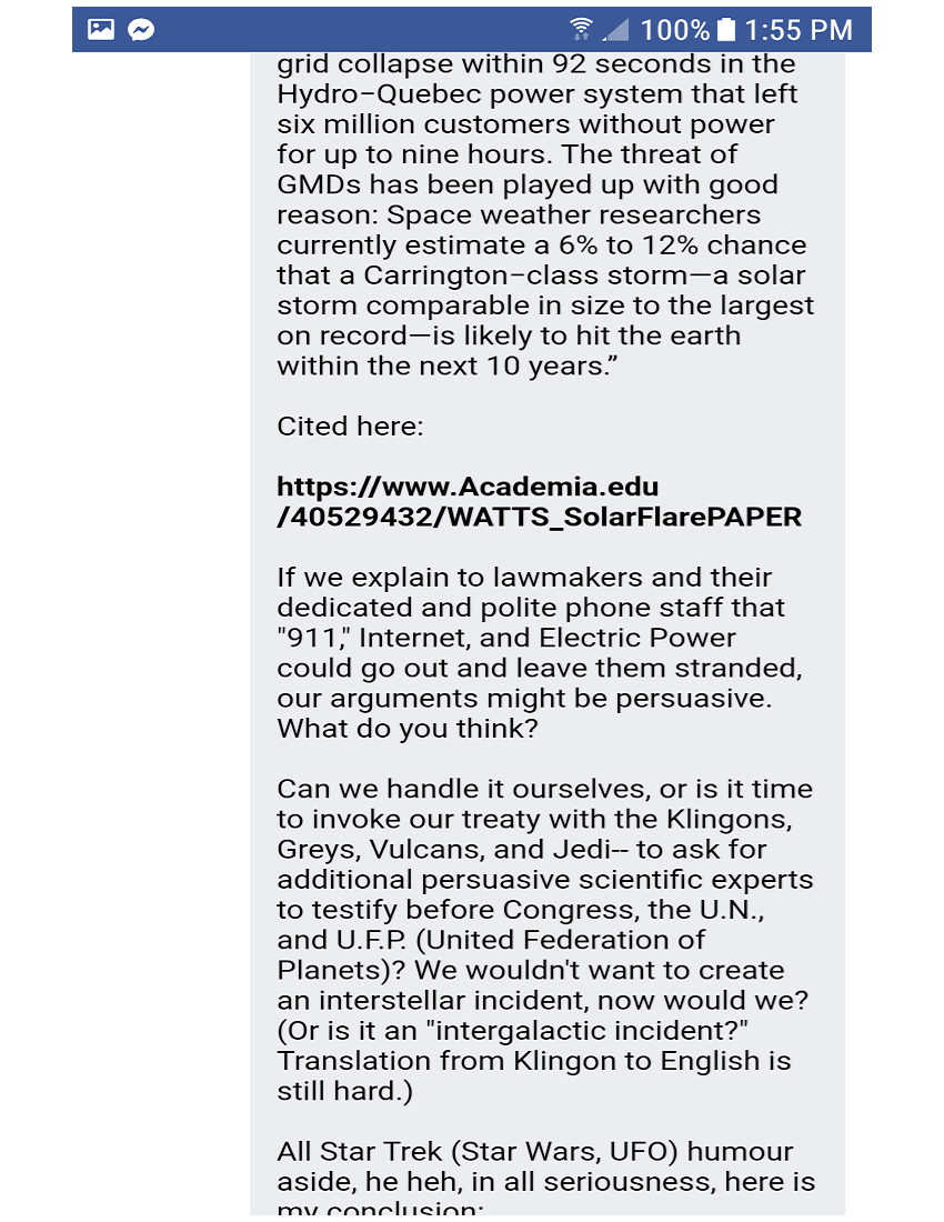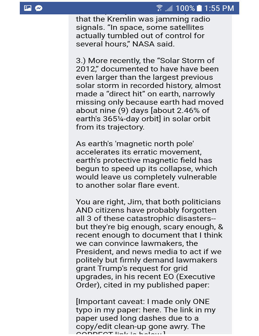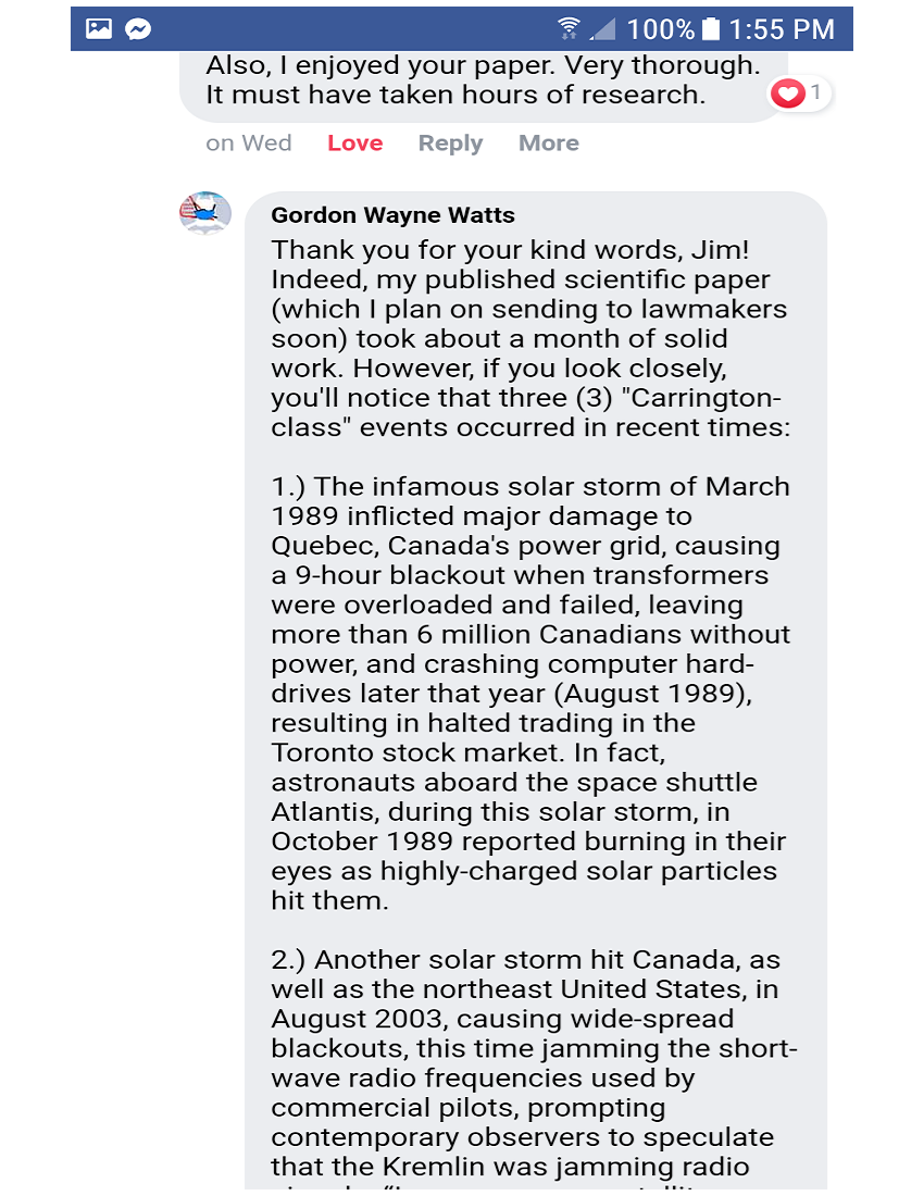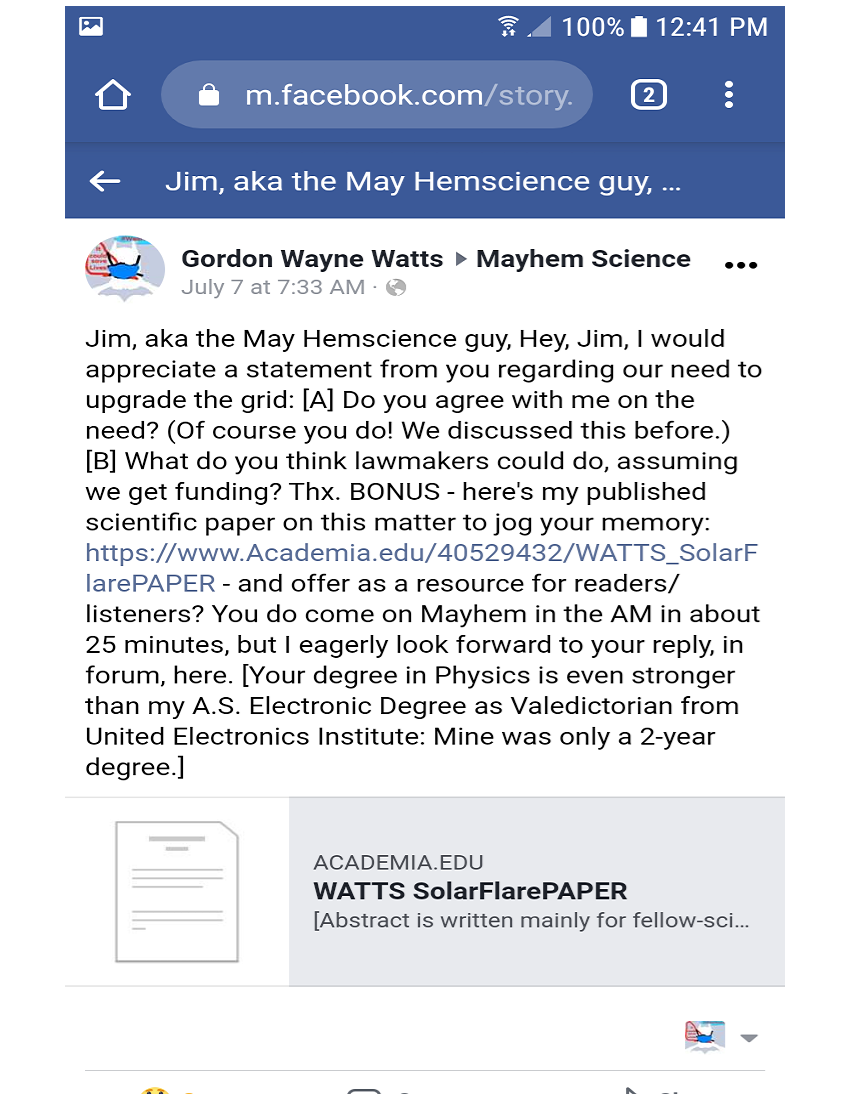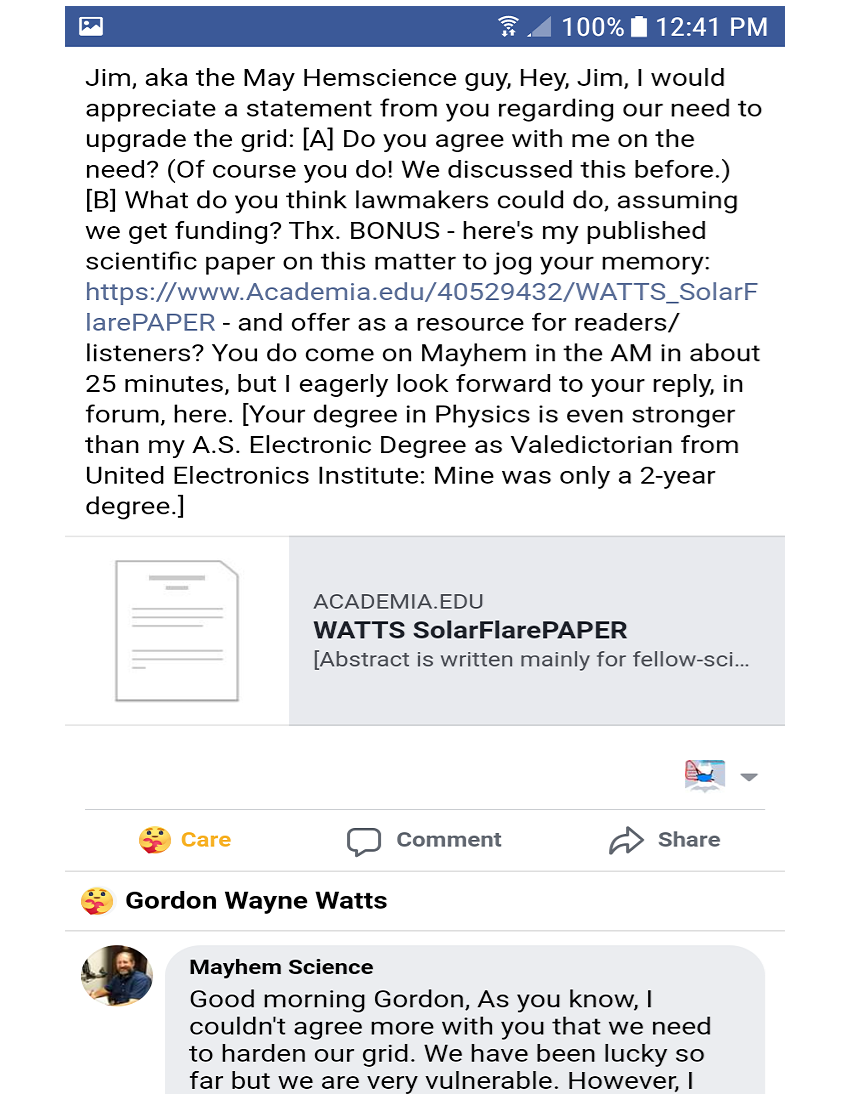 Jim, aka the May Hemscience guy, Hey, Jim, I would appreciate a statement from you regarding our need to upgrade the grid: [A] Do you agree with me on the need? (Of course you do! We discussed this before.) [B] What do you think lawmakers could do, assuming we get funding? Thx. BONUS - here's my published scientific paper on this matter to jog your memory: https://www.Academia.edu/40529432/WATTS_SolarFlarePAPER - and offer as a resource for readers/ listeners? You do come on Mayhem in the AM in about 25 minutes, but I eagerly look forward to your reply, in forum, here. [Your degree in Physics is even stronger than my A.S. Electronic Degree as Valedictorian from United Electronics Institute: Mine was only a 2-year degree.]