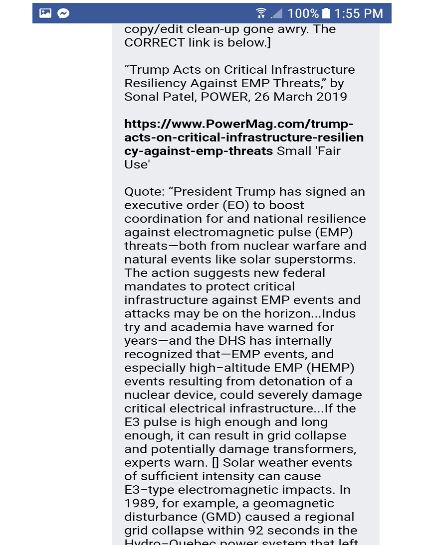 https://www.PowerMag.com/trump-acts-on-critical-infrastructure-resiliency-against-emp-threats Small 'Fair Use' Quote: “President Trump has signed an executive order (EO) to boost coordination for and national resilience against electromagnetic pulse (EMP) threats—both from nuclear warfare and natural events like solar superstorms. The action suggests new federal mandates to protect critical infrastructure against EMP events and attacks may be on the horizon...Industry and academia have warned for years—and the DHS has internally recognized that—EMP events, and especially high−altitude EMP (HEMP) events resulting from detonation of a nuclear device, could severely damage critical electrical infrastructure...If the E3 pulse is high enough and long enough, it can result in grid collapse and potentially damage transformers, experts warn. [] Solar weather events of sufficient intensity can cause E3−type electromagnetic impacts. In 1989, for example, a geomagnetic disturbance (GMD) caused a regional grid collapse within 92 seconds in the Hydro−Quebec power system that left six million customers without power for up to nine hours. The threat of GMDs has been played up with good reason: Space weather researchers currently estimate a 6% to 12% chance that a Carrington−class storm—a solar storm comparable in size to the largest on record—is likely to hit the earth within the next 10 years.”
