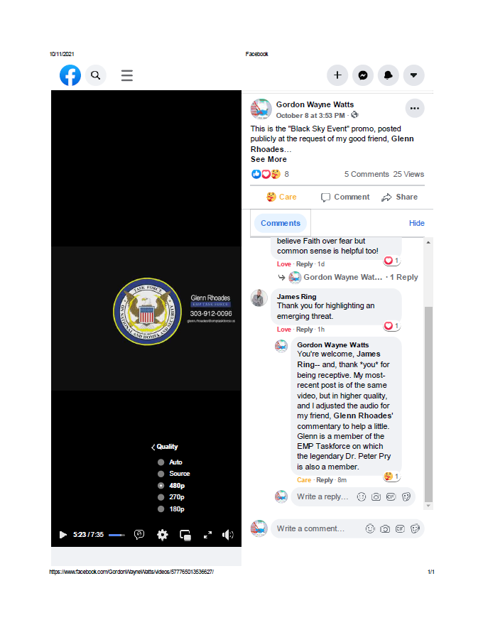RECAP – ((7)) Sgt. James Ring, retired, LAKELAND (FLA.) POLICE DEPARTMENT, and currently the Outreach Coordinator for U.S. Congressman C. Scott Franklin (R-FL-15) – In response to my recent Facebook video post, a promo for the "Black Sky Event" movie about protecting the power/telcom grid from Solar Storms, EMP attacks, hacking, and cyber-attacks etc, James had this to say: