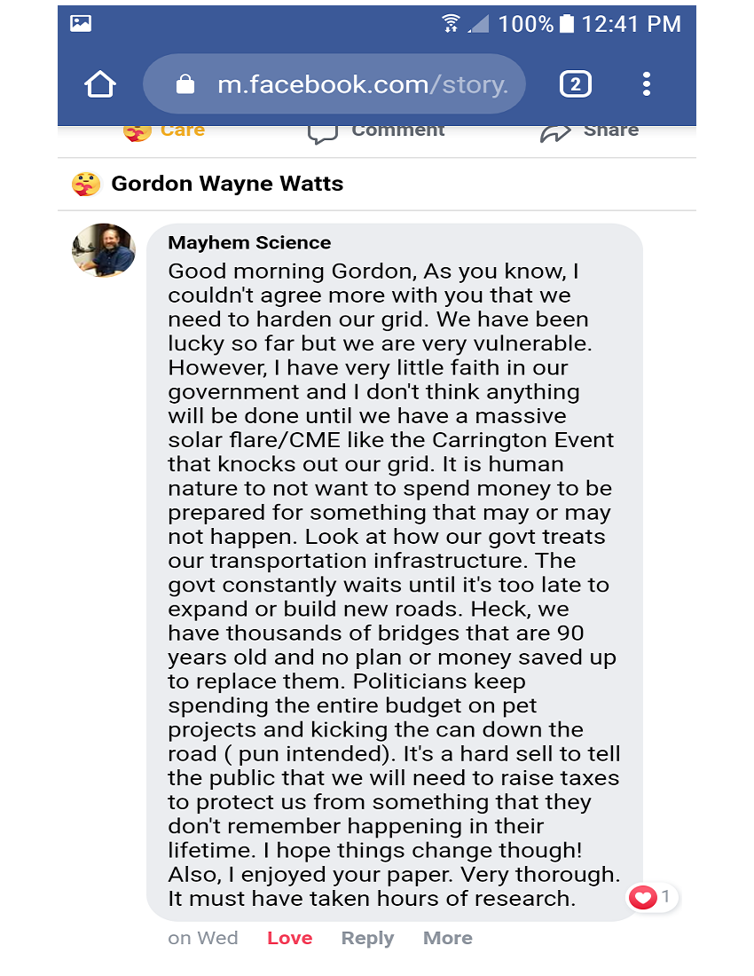 Good morning Gordon, As you know, I couldn't agree more with you that we need to harden our grid. We have been lucky so far but we are very vulnerable. However, I have very little faith in our government and I don't think anything will be done until we have a massive solar flare/CME like the Carrington Event that knocks out our grid. It is human nature to not want to spend money to be prepared for something that may or may not happen. Look at how our govt treats our transportation infrastructure. The govt constantly waits until it's too late to expand or build new roads. Heck, we have thousands of bridges that are 90 years old and no plan or money saved up to replace them. Politicians keep spending the entire budget on pet projects and kicking the can down the road ( pun intended). It's a hard sell to tell the public that we will need to raise taxes to protect us from something that they don't remember happening in their lifetime. I hope things change though! Also, I enjoyed your paper. Very thorough. It must have taken hours of research.