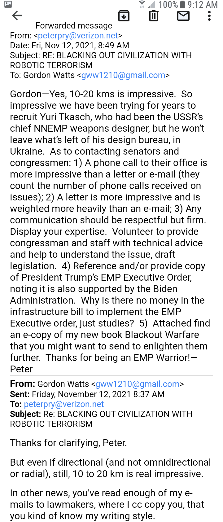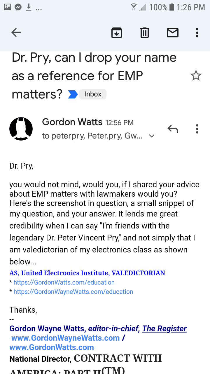 (22) A special word from Dr. Peter Vincent Pry, Chief of Staff of the newly re-established Congressional Electromagnetic Pulse (EMP) Commission, and Executive Director of the Task Force on National and Homeland Security – personal email from Dr. Pry to the undersigned writer, Gordon Wayne Watts ///