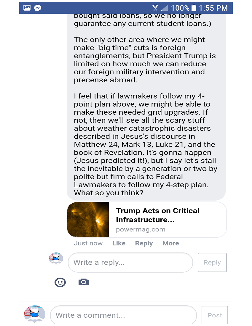 I feel that if lawmakers follow my 4-point plan above, we might be able to make these needed grid upgrades. If not, then we'll see all the scary stuff about weather catastrophic disasters described in Jesus's discourse in Matthew 24, Mark 13, Luke 21, and the book of Revelation. It's gonna happen (Jesus predicted it!), but I say let's stall the inevitable by a generation or two by polite but firm calls to Federal Lawmakers to follow my 4-step plan.