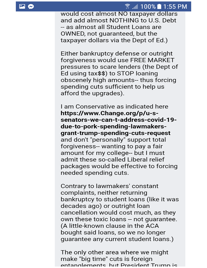 I am Conservative as indicated here https://www.Change.org/p/u-s-senators-we-can-t-address-covid-19-due-to-pork-spending-lawmakers-grant-trump-spending-cuts-request and don't "personally" support total forgiveness-- wanting to pay a fair amount for my college-- but I must admit these so-called Liberal relief packages would be VERY effective to forcing needed spending cuts. Contrary to lawmakers' constant complaints, neither returning bankruptcy to student loans (like it was decades ago) or outright loan cancellation would cost much, as they own these toxic loans -- not guarantee. (A little-known clause in the ACA bought said loans, so we no longer guarantee any current student loans.)