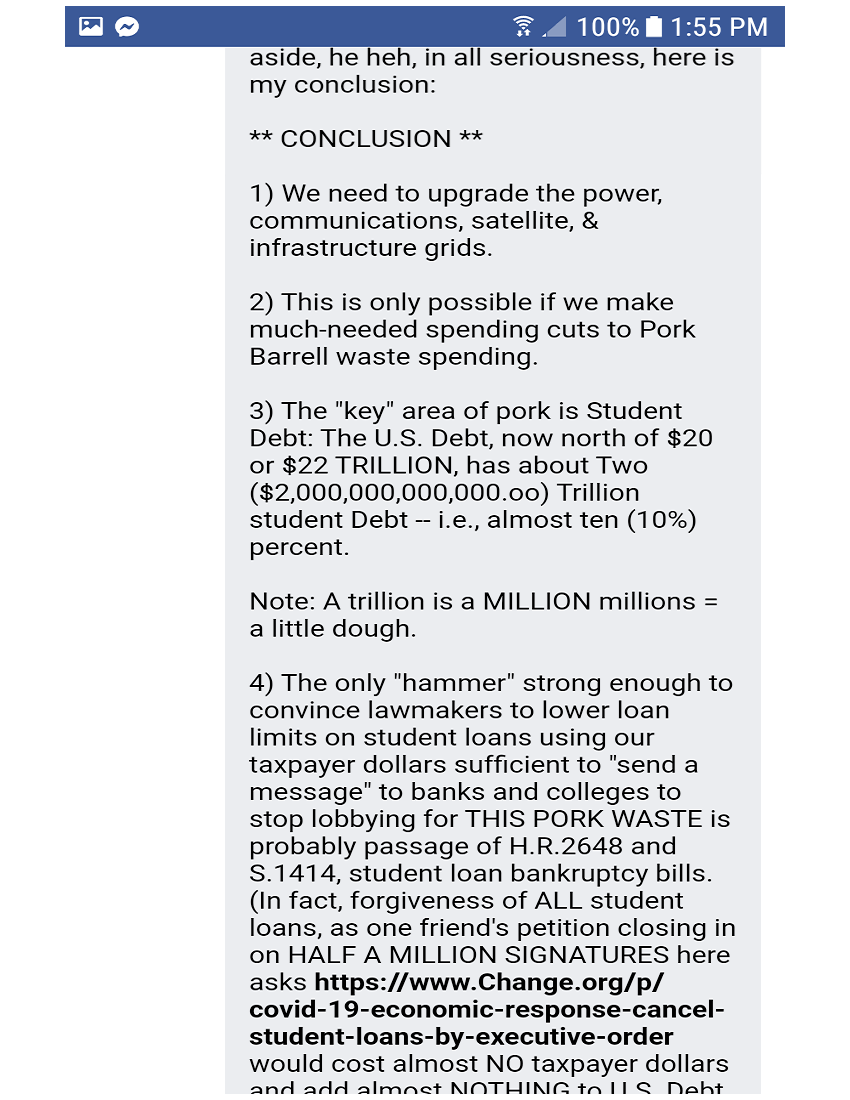 4) The only "hammer" strong enough to convince lawmakers to lower loan limits on student loans using our taxpayer dollars sufficient to "send a message" to banks and colleges to stop lobbying for THIS PORK WASTE is probably passage of H.R.2648 and S.1414, student loan bankruptcy bills. (In fact, forgiveness of ALL student loans, as one friend's petition closing in on HALF A MILLION SIGNATURES here asks https://www.Change.org/p/covid-19-economic-response-cancel-student-loans-by-executive-order would cost almost NO taxpayer dollars and add almost NOTHING to U.S. Debt -- as almost all Student Loans are OWNED, not guaranteed, but the taxpayer dollars via the Dept of Ed.)