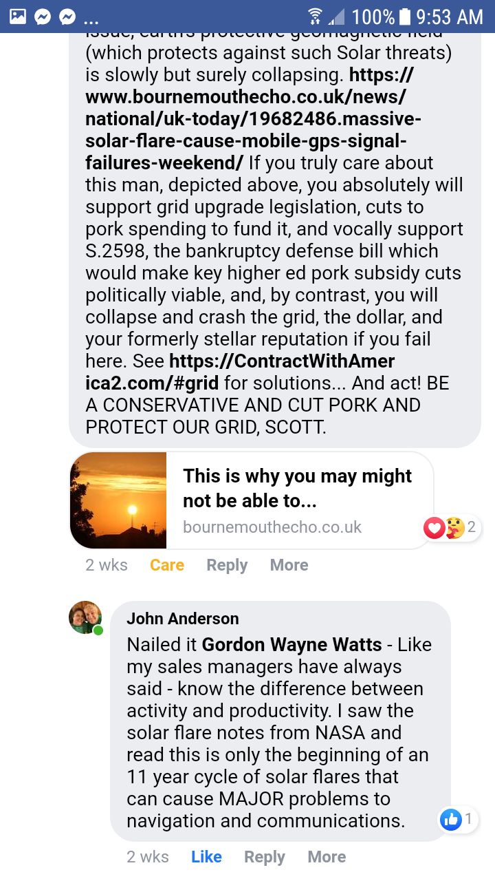 (20) Many others: Ask petition-writer, Gordon Wayne Watts, for a list of friends who email and Facebook him—and others—about this. (Note to self: Crazy Robert William “Bob” Hartung's many emails; many Facebook friends of Mike Schmidt who “came out of the woodwork” in support of Mr. Schmidt when he was planning to run against Ross Spano in the GOP primary for Fla. Dist. 15, U.S. House of Representatives; “OpenTheBooks” private advocacy website regarding pork spending excesses; friends of both political parties who are opposed to endless wars, which [[a]] costs lives of American servicemen and servicewomen; [[b]] cost goodwill with other nations; and [[c]] cost Trillions, if not TENS of Trillions of precious and limited taxpayer dollars; Etc.) Many other friends and neighbours of Gordon W. Watts regularly report to him that they are disgusted with the irresponsibly reckless spendthrift spending habits of lawmakers (of both parties) who spend/waste our taxpayer dollars “like drunken sailors.” (Apologies to all drunken sailors for the comparison!) Too numerous to name, but ask them—if you are not afraid!