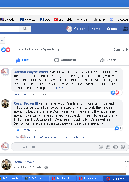 (16) Polk County resident, Royal Brown III (a member of a local Republican club) Is a Heritage Action Sentinel who, along with his wife, Glynnda, do their best to influence our elected officials to curb their excess spending. Has gone on record publicly with his advocacy in a public Facebook post. Laments public ignorance that don't know a “Trillion” dollars is a THOUSAND billions. Opposes and decries RINO republicans and spendthrift Democrats who have desensitized the American public to lawmakers' reckless spending habits. Is NOT alone in the general public—but space does not permit me to “squeeze in” ALL the “angry as a hornet” comments from disgusted American citizens (see #14 & #15, below) of both or all political parties—yes, including many Democrats (see #12, above) who oppose wasteful excesses in our obscenely reckless spending of precious and limited taxpayer dollars. – References below...