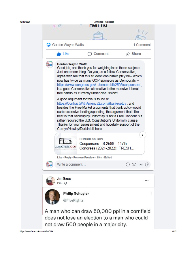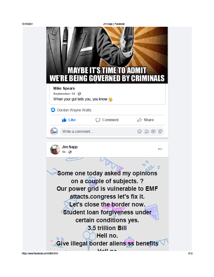 (17) Polk County resident, Jim Sapp: I asked Jim (one of the smartest and most honest people I know, a prominent businessman, and a constituent in FLORIDA'S 15TH U.S. Congressional District–my district too) to give me a supportive public statement so we can “join voices” and “collectively” ask our Federal lawmakers to STOP harmful, inflationary excessive pork spending. QUOTE: “Some one today asked my opinions [] on a couple of subjects. ? [] Our power grid is vulnerable to EMF [] attacts[sic].congress let's fix it. [] Let's close the border now. [] Student loan forgiveness under certain conditions yes. [] 3.5 trillion Bill [] Hell no. [] Give illegal border aliens ss benefits [] Hell no” – References below...
