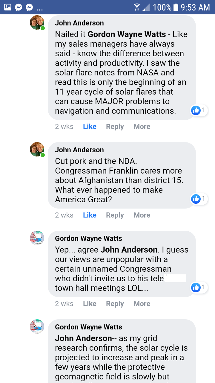 (16) Royal Brown III (local Republican and Heritage Sentinel), (17) Jim Sapp (local republican businessman), (18) Paul Hatfield, VP of local Republican Club & Financial expert, and (19) John R. Anderson (local Democrat constituent and regular visitor to Congressman Franlkin's Facebook) ALL support cutting harmful pork sending.